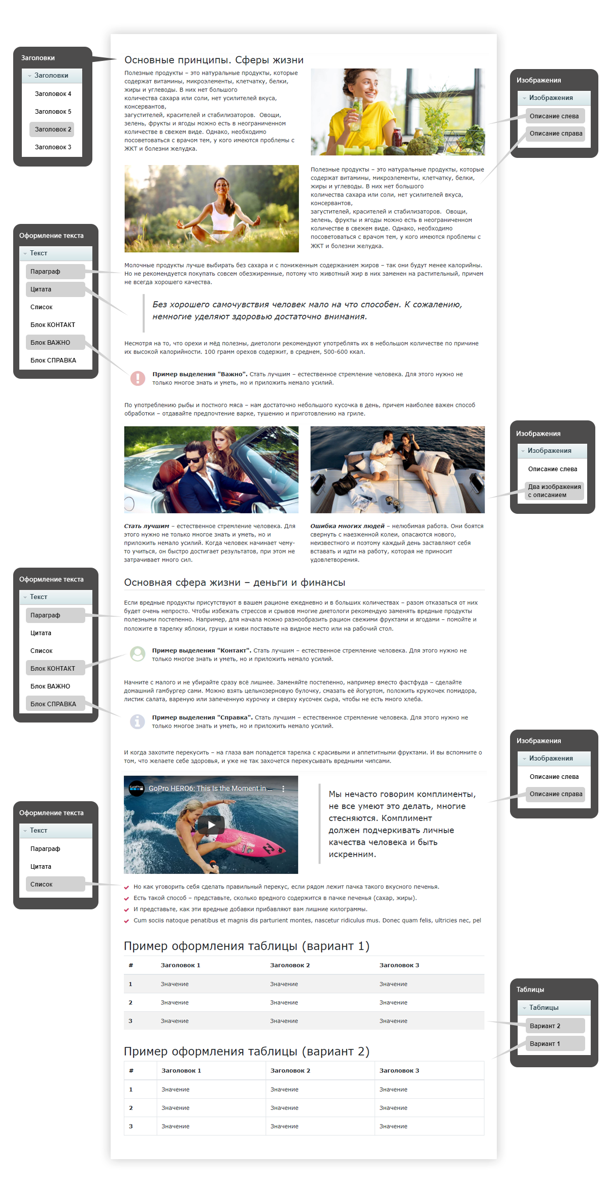 • готовые шаблоны(сниппеты) для добавления различных фрагментов на страницу (заголовки, сноски, цитаты, таблицы, изображения, видео...)