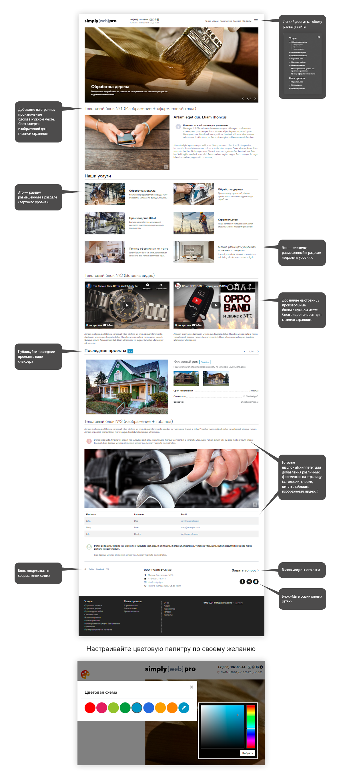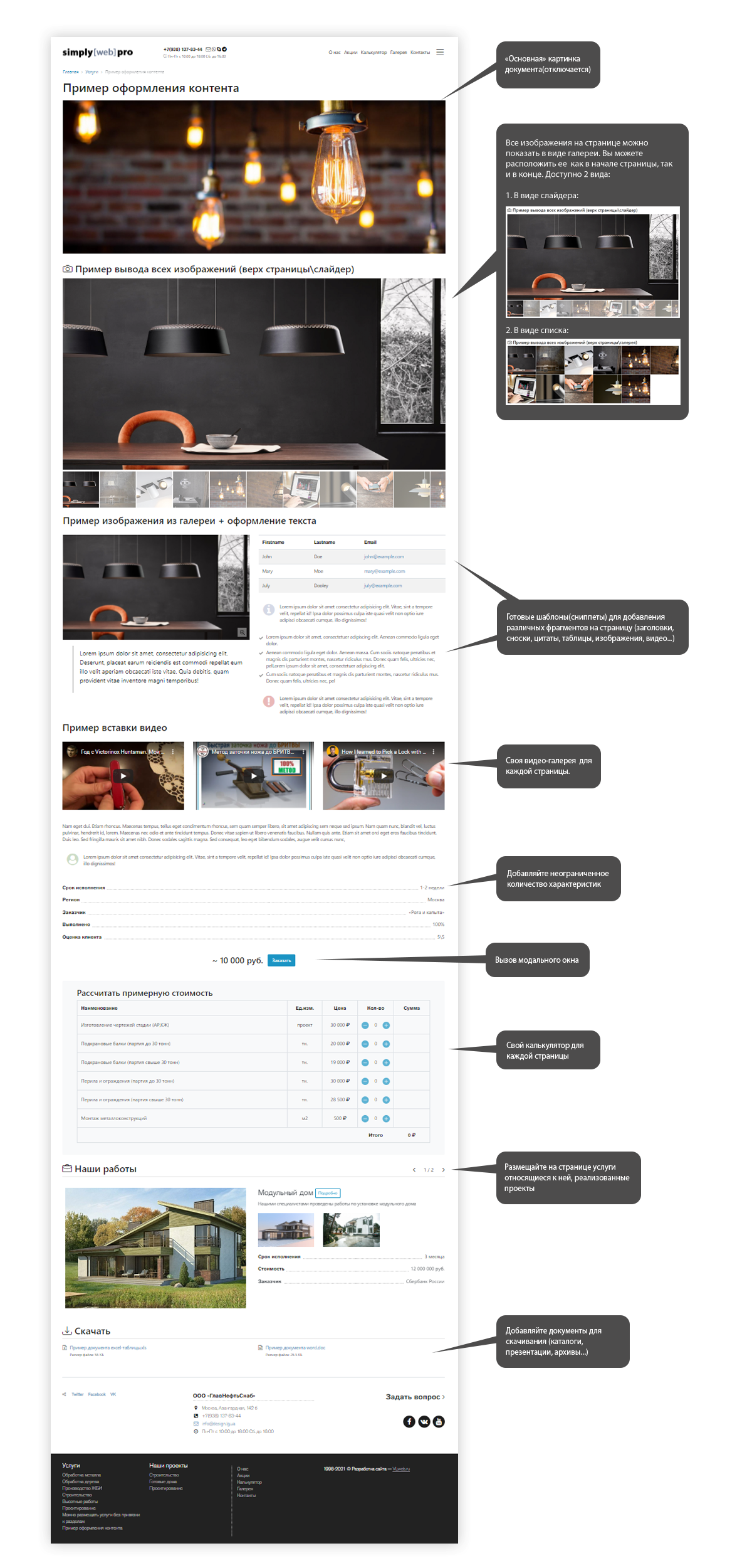 • простое добавление изображений(с увеличением) и видео на страницу